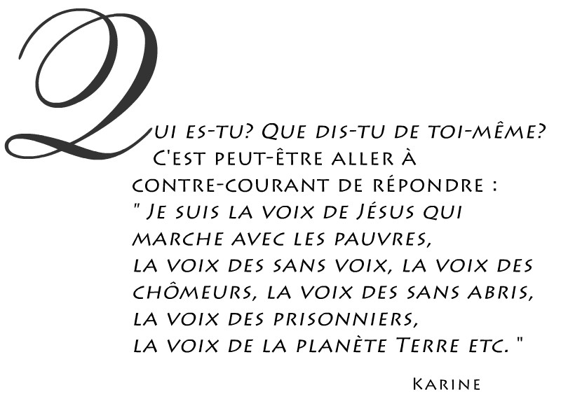 Ce passage m’interpelle parce que nous vivons dans une société qui valorise beaucoup le savoir, l’avoir, le pouvoir et le paraître. Quand nous sommes confrontés à cette question : « qui es-tu? » tout de suite nous sommes portés à répondre par ce que nous faisons, le poste que nous occupons etc. mais jamais par la mission qui nous habite. La culture de notre société ne nous a pas habitué à vivre à partir de notre mission d’être parce qu’il faut faire rouler l’économie du marché, vivre pour la consommation et passer à côté de notre mission première. Nous laissons parfois les autres nous définir et nous fléchissons aux valeurs du marché pour se créer un chemin de réussite sociale au détriment de notre vie spirituelle. Nous devons consciemment nous redéfinir et répondre à cette question qui vient nous chercher de l’intérieur : Qui es-tu? Que dis-tu de toi-même? C’est peut-être aller à contre-courant de répondre : « Je suis la voix de Jésus qui marche avec les pauvres, la voix des sans voix, la voix des chômeurs, la voix des sans abris, la voix des prisonniers, la voix de la planète Terre etc.