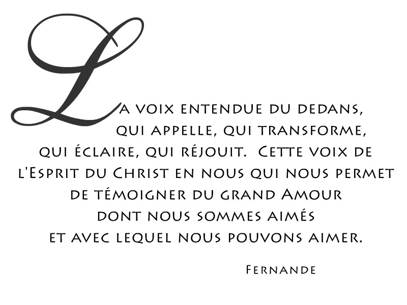 « Je suis la voix de celui qui crie dans le désert. » La voix entendue du dedans, qui appelle, qui transforme, qui éclaire, qui réjouit. Cette voix de l’Esprit du Christ en nous qui nous permet de témoigner du grand Amour dont nous sommes aimés et avec lequel nous pouvons aimer.