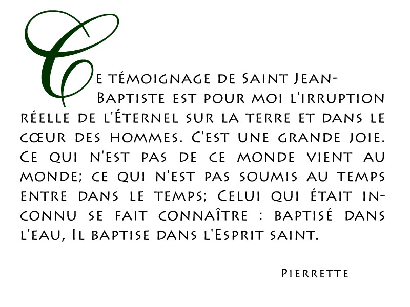 Ce témoignage de Saint Jean-Baptiste est pour moi l’irruption réelle de l’Éternel sur la terre et dans le cœur des hommes. C’est une grande joie. Ce qui n’est pas de ce monde vient au monde; ce qui n’est pas soumis au temps entre dans le temps; Celui qui était inconnu se fait connaître : baptisé dans l’eau, Il baptise dans l’Esprit saint.
