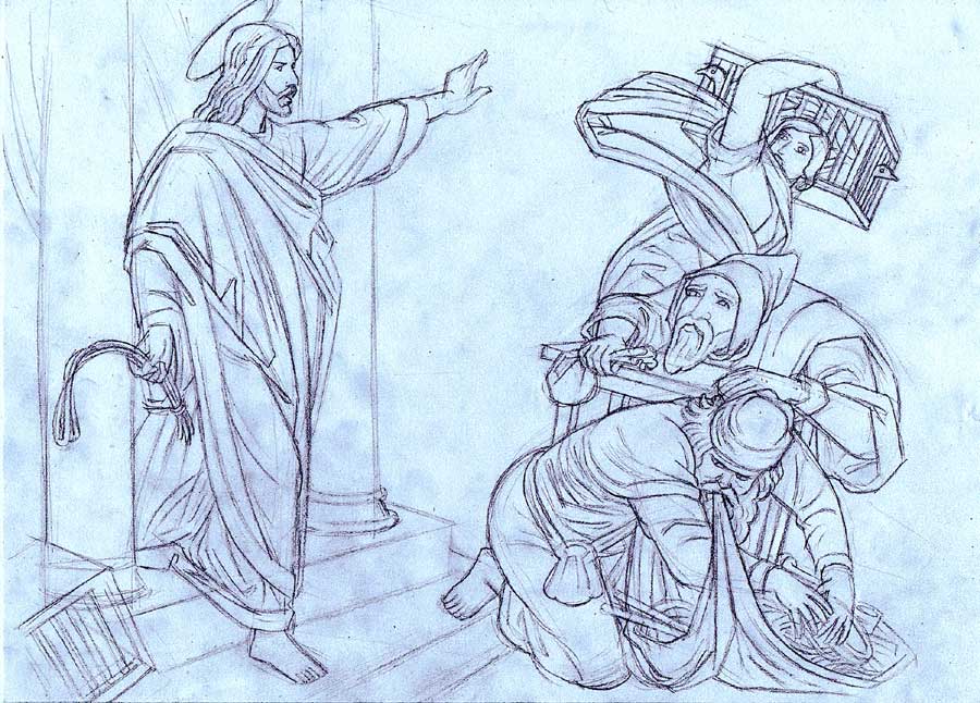 Des illustrations plus simples représentent Jésus en interaction avec trois personnages figurant les marchands, les changeurs de monnaie et les vendeurs de colombes. L’illustration ci-dessous s’inspire de l’une d’entre-elles.