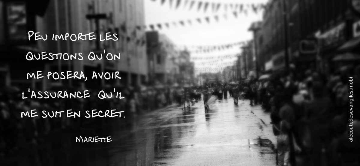 » Montez, vous, à cette fête, pour moi mon temps n’est pas encore venu « . Ça me dit qu’il m’invite à monter à la fête de ma « Galilée « . Peu importe les questions qu’on me posera, avoir l’assurance qu’il me suit en secret. Les Juifs le cherchaient et disaient « ou est-il « ?