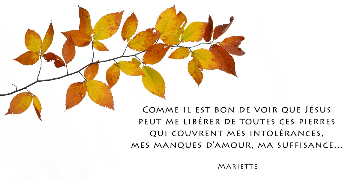Comme il est bon de voir que Jésus peut me libérer de toutes ces pierres qui couvrent mes intolérances, mes manques d’amour, ma suffisance, tous ces péchés qui sentent mauvais. Tendrement Jésus dit : » Mariette sors , déliez-la et laissez-la aller, quel réconfort. Père je te rends grâce de ce que vous m’avez exaucé…