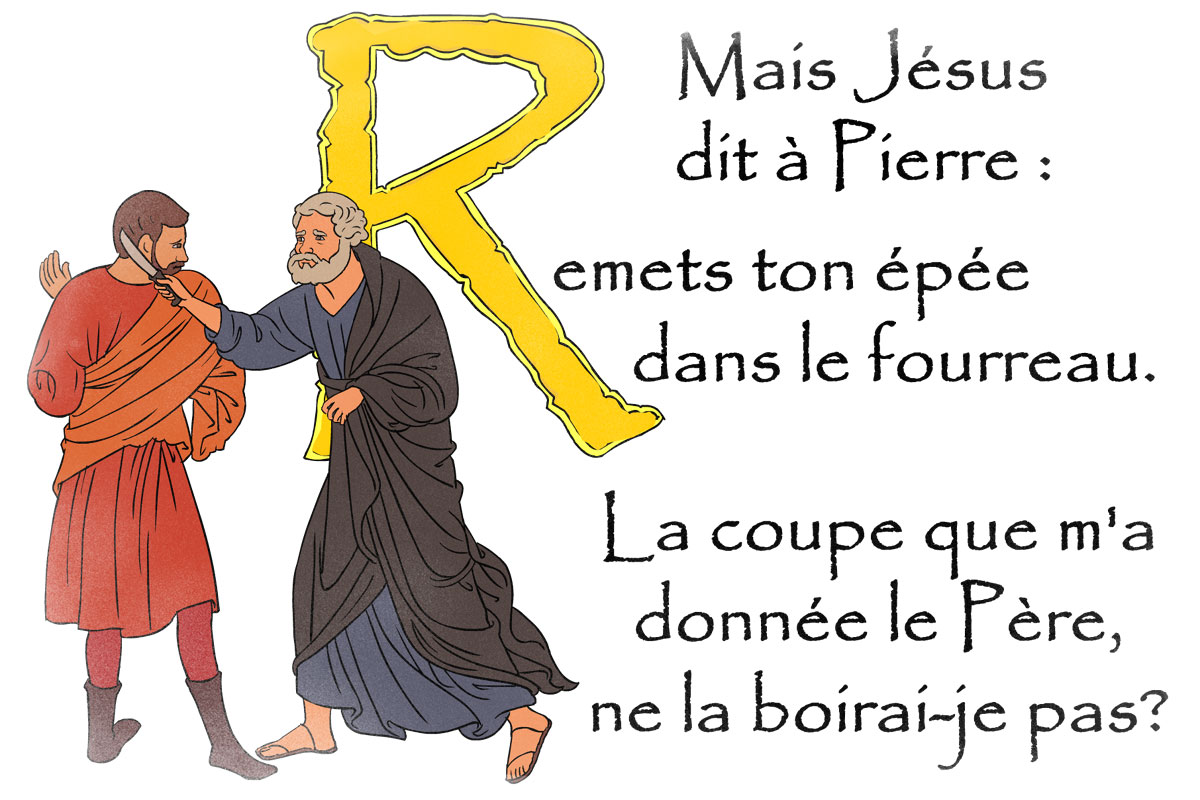 Mais Jésus dit à Pierre : « Remets ton épée dans le fourreau. La coupe que m’a donnée le Père, ne la boirai-je pas? »