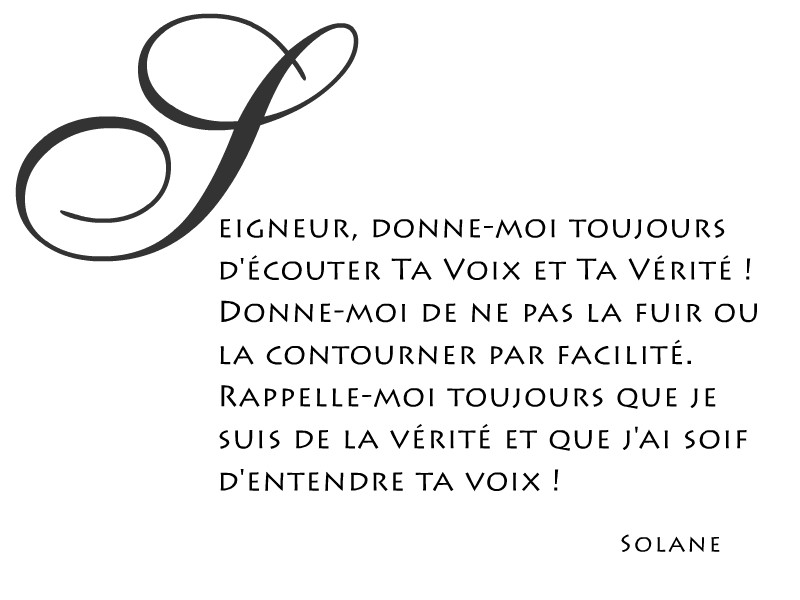 Seigneur, donne-moi toujours d’écouter Ta Voix et Ta Vérité ! Donne-moi de ne pas la fuir ou la contourner par facilité. Rappelle-moi toujours que je suis de la vérité et que j’ai soif d’entendre ta voix !