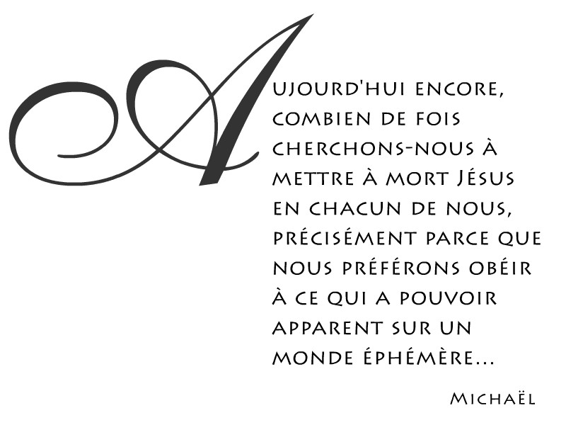 Aujourd’hui encore, combien de fois cherchons-nous à mettre à mort Jésus en chacun de nous, précisément parce que nous préférons obéir à ce qui a pouvoir apparent sur un monde éphémère… plutôt que de s’en remettre à Dieu en qui est la vie, l’amour et la lumière éternellement?