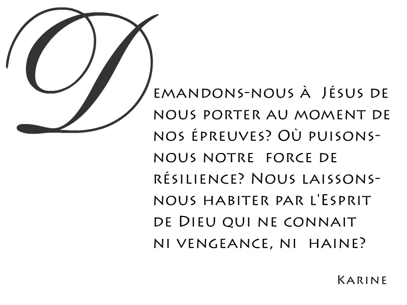Les personnages de ce passage d’évangile me fascinent parce que j’y vois la réalité du monde politique et spirituel. Je regarde Pilate, les grands prêtres, les gardes, la foule et bien entendu Jésus qui sait que son pouvoir n’est pas de ce monde. Pilate se lave les mains sous la pression populaire. Combien de fois sommes-nous témoins de scènes injustes sans pour autant lever le petit doigt pour empêcher l’irréparable? Les grands prêtres qui sont les docteurs de la loi mettent tout en œuvre pour faire condamner Jésus et ses disciples en s’appuyant sur la loi de Moïse. N’agissons-nous pas souvent comme eux parce que nous possédons le savoir infuse et refusons toute idée ou vision nouvelle qui vienne questionner notre façon de faire ou de concevoir le monde? Les gardes, eux, ont pour fonction d’exécuter les ordres de leur chef. Ne sommes-nous pas des fois comme des automates qui exécutent les directives de nos patrons sans dire un mot même si ce que l’on nous demande va à l’encontre de nos valeurs, de notre conscience? La foule comme toujours suit la tendance des médias populaires. Sommes-nous assez critique des nouvelles reçues à travers les médias? Prenons-nous le temps de nous informer et d’analyser les événements pour mieux exercer notre jugement à la lumière de l’évangile? Finalement nous avons Jésus, le Fils de Dieu, le verbe incarné. Il est seul au milieu de cette tempête. Il n’a plus d’amis, de disciples pour l’entourer en ce moment crucial de sa vie d’homme. Confiant et serein, Il décide d’aller jusqu’au bout de sa mission en misant sur l’amour de son Père. Il ne craint rien parce qu’Il sait que son Père lui donnera la force intérieure pour passer à travers ce calvaire et qu’Il ressuscitera pour la plus grande gloire de Dieu. Sommes-nous des fois dans des situations où nous nous faisons intimider, harceler, humilier…? Demandons-nous à Jésus de nous porter au moment de nos épreuves? Où puisons-nous notre force de résilience? Laissons-nous habiter par l’Esprit de Dieu qui ne connait ni vengeance, ni haine?