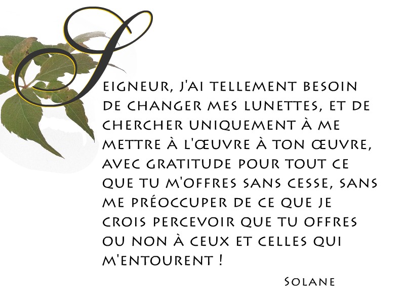 Seigneur, j’ai tellement besoin de changer mes lunettes, et de chercher uniquement à me mettre à l’œuvre à ton œuvre, avec gratitude pour tout ce que tu m’offres sans cesse, sans me préoccuper de ce que je crois percevoir que tu offres ou non à ceux et celles qui m’entourent !