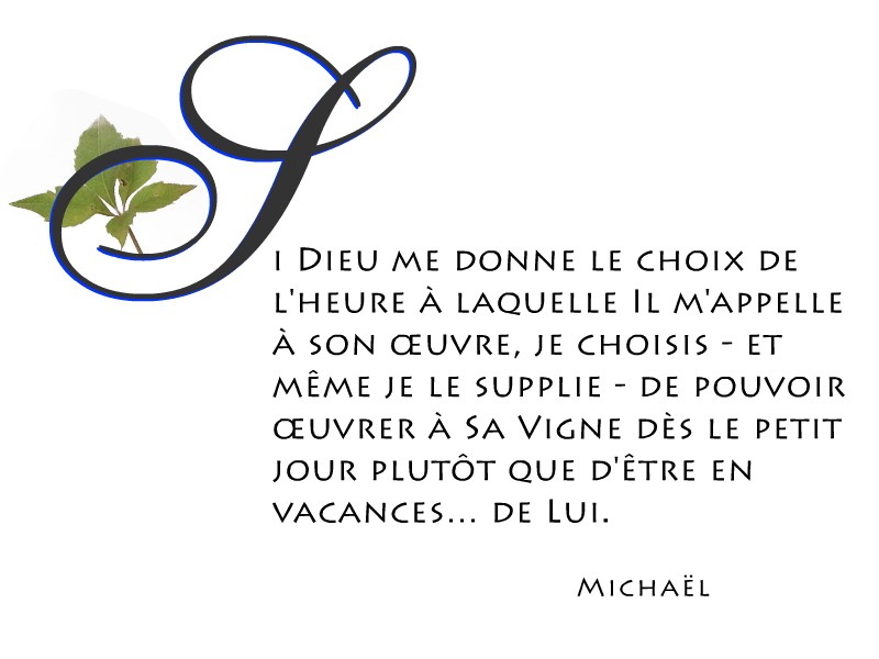 Dans cette parabole, on pourrait se dire qu’il vaut mieux être l’ouvrier de la dernière heure, ne travailler qu’une seule heure de la journée pour un salaire équivalent à ceux qui ont peiné pendant tout le jour… (?) …mais lorsque je me pose maintenant la question très honnêtement, je n’ai pas d’hésitation : Si Dieu me donne le choix de l’heure à laquelle Il m’appelle à son œuvre, je choisis – et même je le supplie – de pouvoir œuvrer à Sa Vigne dès le petit jour plutôt que d’être en vacances… de Lui.