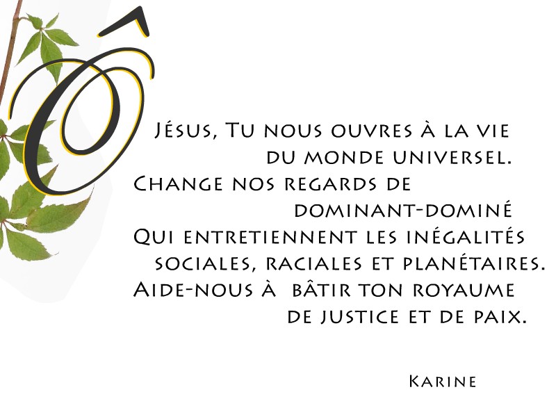 Encore plus loin : en écoutant les bruits de guerre un peu partout sur la planète, comment imaginer que ces soldats embrigadés dans des luttes fratricides – et leurs leaders – sont dignes eux aussi de bénéficier du regard de ce maître attentif et miséricordieux? Apprends-moi, Seigneur, cet amour sans mesure qui est allé jusqu’à envoyer ton propre Fils dans la profondeur de nos enfermements afin que nous puissions partager avec lui la joie de te servir en créant un monde solidaire envers les plus petits.