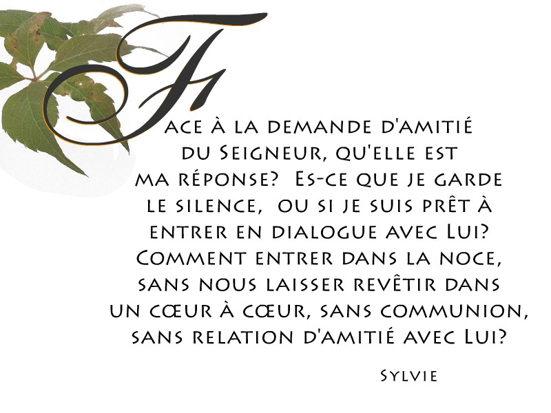 Face à la demande d’amitié du Seigneur, qu’elle est ma réponse? Es-ce que je garde le silence, ou si je suis prêt à entrer en dialogue avec Lui? Comment entrer dans la noce, sans nous laisser revêtir dans un cœur à cœur, sans communion, sans relation d’amitié avec Lui?