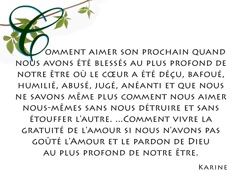 « Tu aimeras le Seigneur ton Dieu de tout ton cœur, de toute ton âme et de tout ton esprit et tu aimeras ton prochain comme toi-même. » Ce commandement de Dieu semble si facile à mettre en pratique mais en réalité il est si complexe et si difficile parce que nous sommes des êtres blessés qui ont besoin d’aimé et d’être aimé en retour. Comment aimer son prochain quand nous sommes habités par le « vieil homme », c’est-à-dire quand l’orgueil, la convoitise, la jalousie, la rivalité, la colère, la haine, la vengeance… dictent notre comportement. Comment aimer son prochain quand nous avons été blessés au plus profond de notre être où le cœur a été déçu, bafoué, humilié, abusé, jugé, anéanti et que nous ne savons même plus comment nous aimer nous-mêmes sans nous détruire et sans étouffer l’autre. Comment vraiment aimer son prochain quand nous cherchons nos propres intérêts et quand il doit mériter notre amour. Comment vivre la gratuité de l’amour non seulement avec ceux et celles que nous aimons tout naturellement ou choisissons d’aimer mais aussi avec ceux et celles que nous avons la difficulté à aimer. Comment vivre la gratuité de l’amour si nous n’avons pas goûté l’Amour et le pardon de Dieu au plus profond de notre être.
