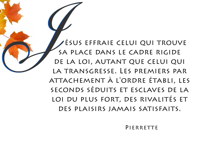 Comme il est difficile à l’âme pharisienne de concevoir que la loi tombe en poussière, inutile, là où l’amour s’incarne, se fait entendre, voir et obéir ! Le moraliste et le légaliste en nous, s’insurgent contre cette vérité, faute de l’avoir approchée suffisamment pour connaître la magnifique et libre exigence qu’elle demande. Jésus effraie celui qui trouve sa place dans le cadre rigide de la loi, autant que celui qui la transgresse. Les premiers par attachement à l’ordre établi, les seconds séduits et esclaves de la loi du plus fort, des rivalités et des plaisirs jamais satisfaits.