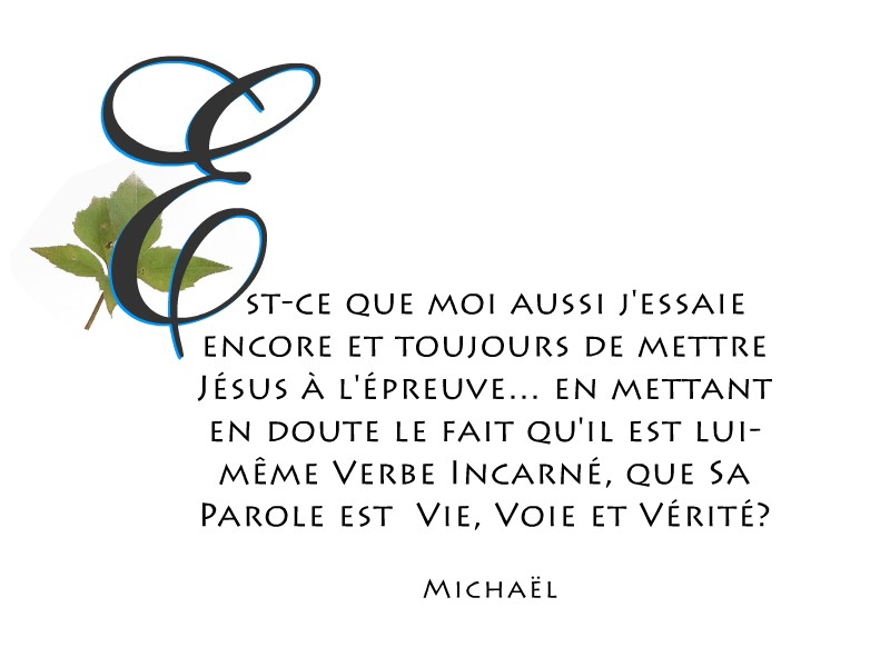 Est-ce que moi aussi j’essaie encore et toujours de mettre Jésus à l’épreuve… en mettant en doute le fait qu’il est lui-même Verbe Incarné, que Sa Parole est Vie, Voie et Vérité?