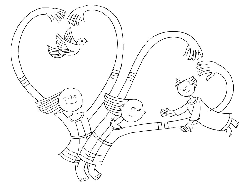 Comment illustrer le double commandement d’amour de Jésus? Nous avons tenté de créer un dessin dans le style des anciennes enluminures, assez simple pour que les enfants puissent le comprendre et le colorier (Utiliser le fichier à imprimer à la fin de cet article)