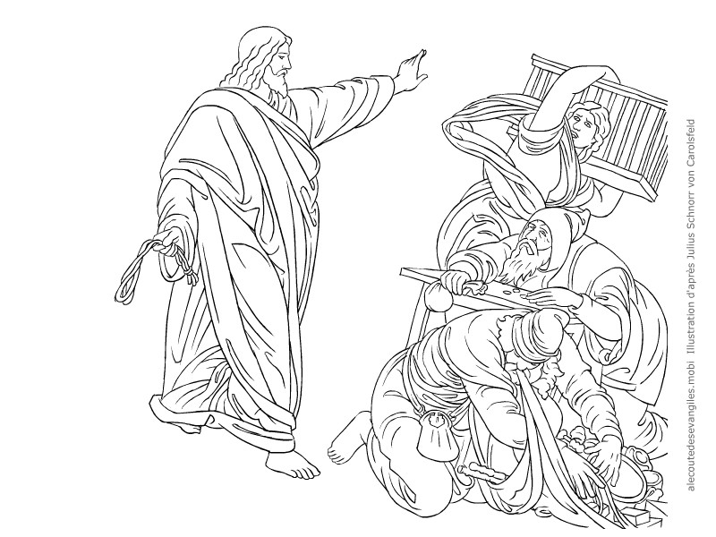 Il fit un fouet avec des cordes, et les chassa tous du Temple ainsi que leurs brebis et leurs bœufs ; il jeta par terre la monnaie des changeurs, renversa leurs comptoirs,