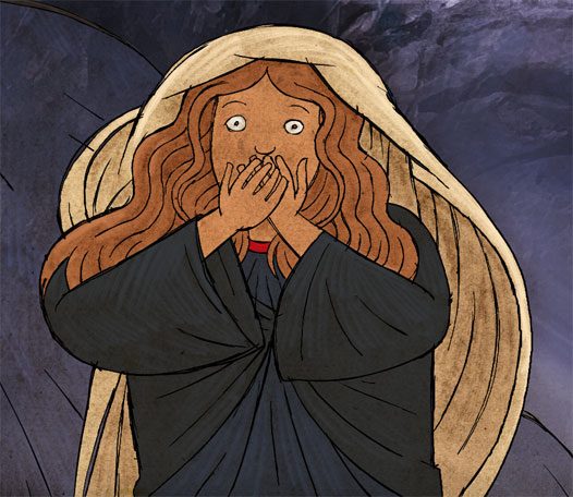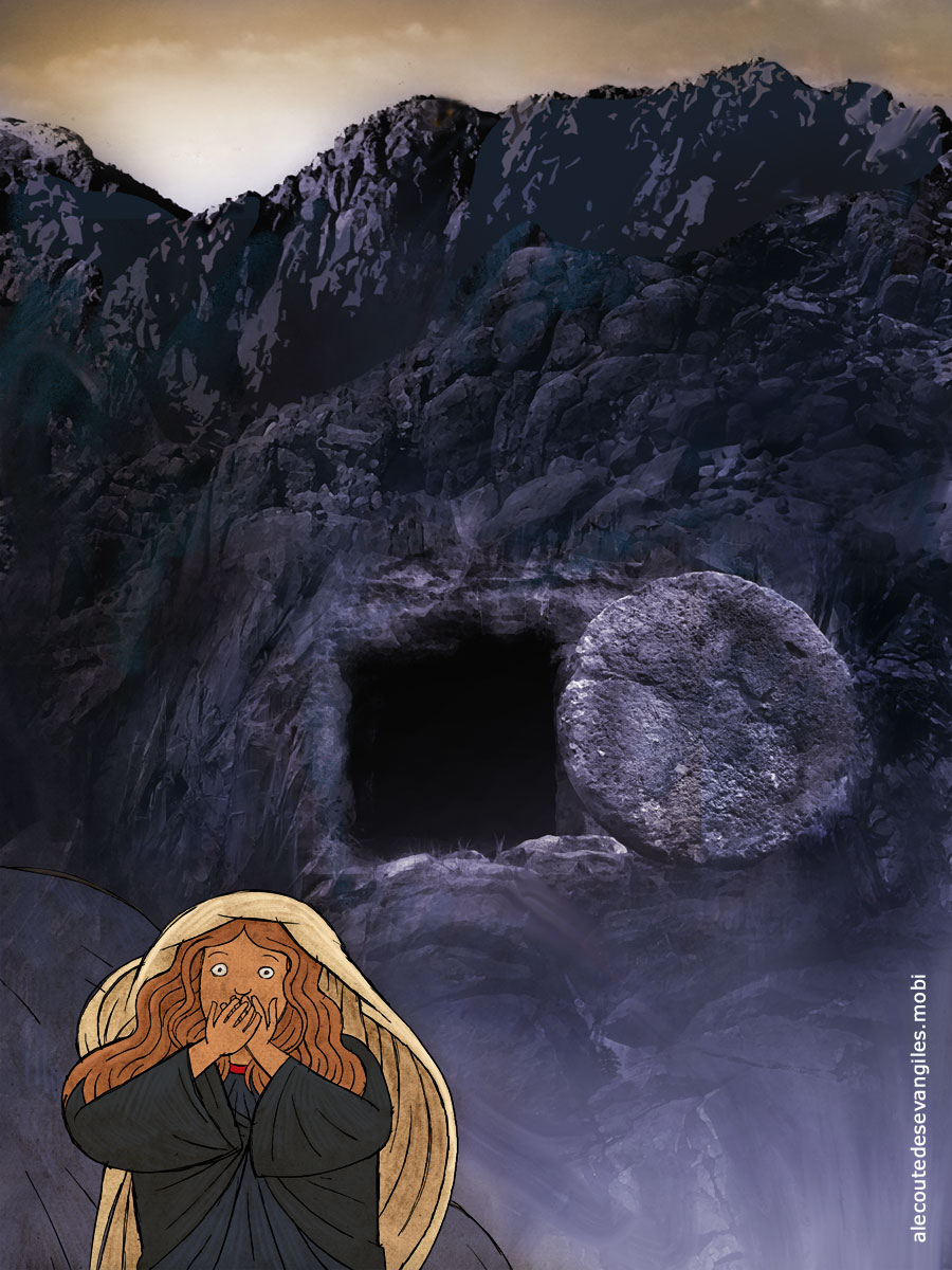Elle s’aperçoit que la pierre a été enlevée du tombeau.