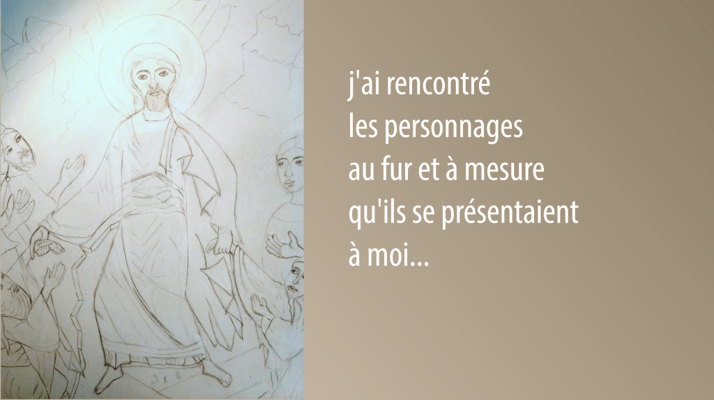 Dans le cas du dessin de la Résurrection, j’ai rencontré les personnages au fur et à mesure qu’ils se présentaient à moi. Quand je sentais que le personnage résonnait en moi avec sa demande intérieure envers Jésus, je rangeais ma gomme à effacer et je mettais de la couleur.