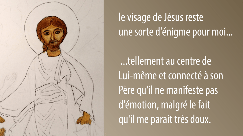 Par contre, le visage de Jésus reste une sorte d’énigme pour moi. Cependant, je peux dire qu’IL est tellement au centre de Lui-même et connecté à son Père qu’il ne manifeste pas d’émotion, malgré le fait que son visage me parait très doux.