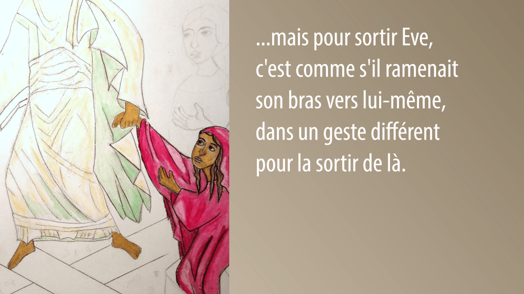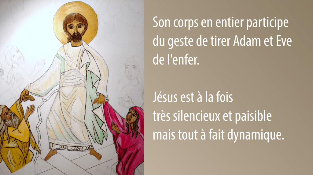 J’aime l’effort que je sens dans ses bras pour sortir Adam et Eve de leur tombeau. Pour Adam, il tire directement, mais pour sortir Eve, c’est comme s’il ramenait son bras vers lui-même, dans un geste différent pour la sortir de là. Son corps en entier participe du geste de tirer Adam et Eve de l’enfer. Il est à la fois très ‘silencieux’ et paisible mais tout à fait dynamique.