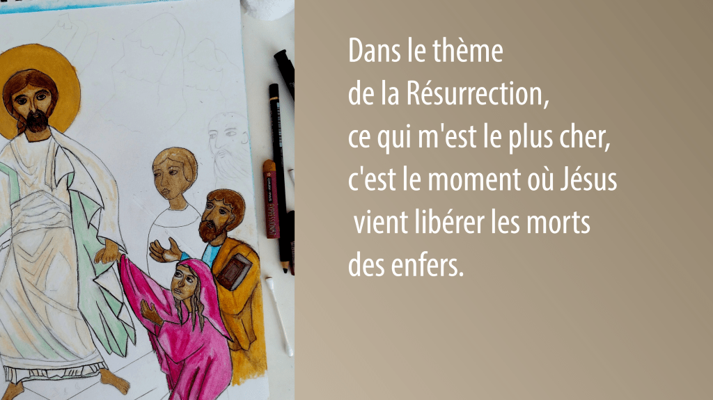Dans le thème de la Résurrection, ce qui m’est le plus cher, c’est le moment où Jésus vient libérer les morts des enfers.