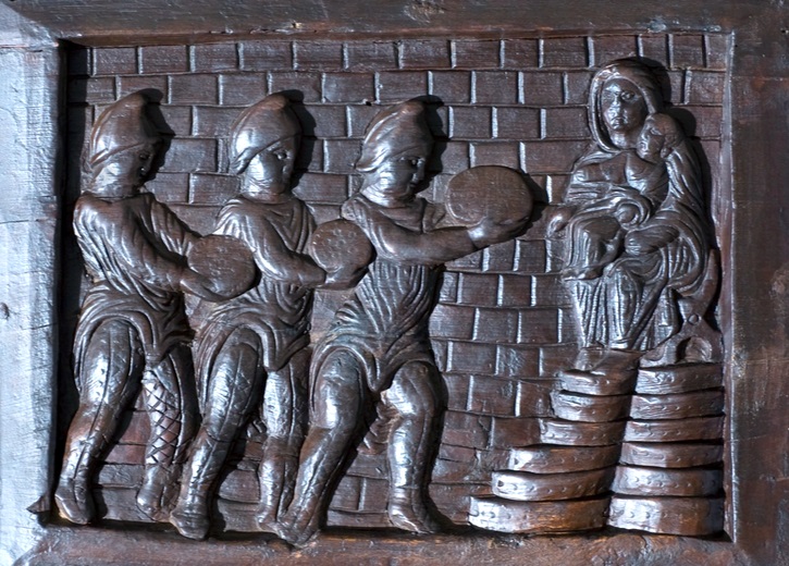 - Adoration des Mages, relief en bois (cyprès), c.430, porte de l’Église Santa Sabina, Rome. Cette porte antique comprend plusieurs scènes de l’Ancien et du Nouveau Testament. Les mages sont identiques, avec un bonnet phrygien (d’Asie-Mineure, aujourd’hui en Turquie), indiquant qu’ils viennent de loin. Ils présentent leurs dons à Marie, surélevée et hiératique, portant une enfant Jésus qui n’est plus un bébé.