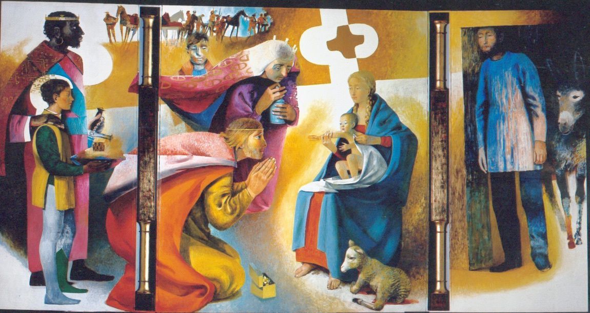 - Visite des Mages d’Orient, Arcabas, 2001, Église Notre-Dame-de-l’Assomption, La-Tour-du-Pin, Isère, France. Dans ce tryptique du grand peintre chrétien français, qui a le don des couleurs et des formes, ce n’est pas l’aîné qui est à genoux. Un agneau est aux pieds de Marie, aux tresses blondes, dont le modèle est la mère de l’artiste. Joseph et l’âne sont en retrait. La croix est présente, comme en plusieurs de ses œuvres.
