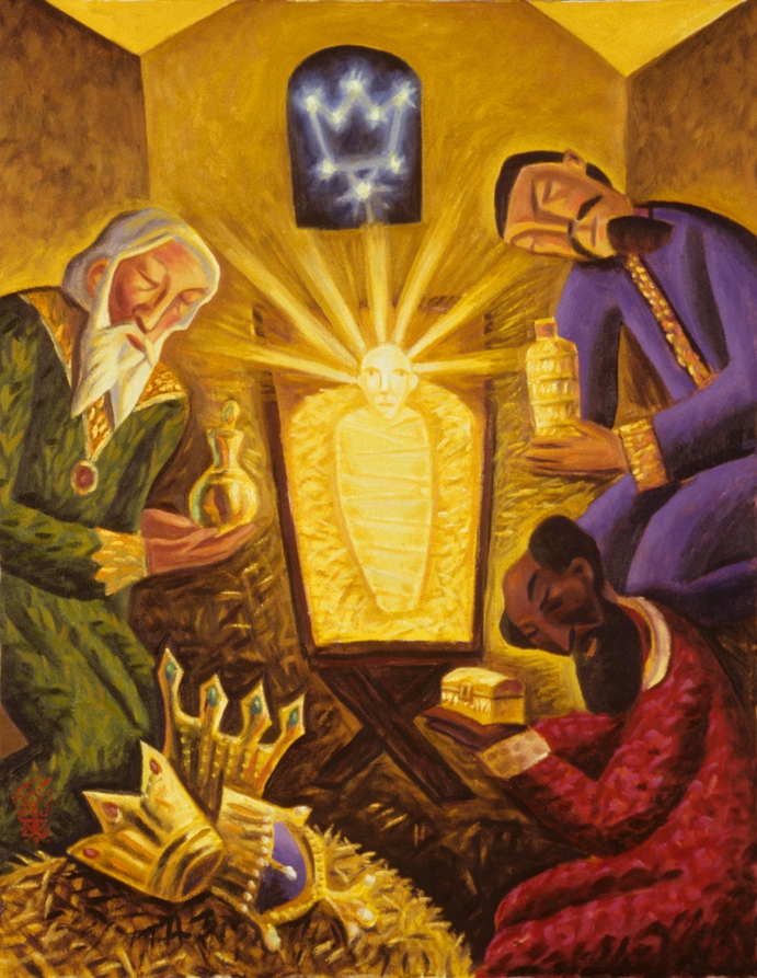 - Adoration of the Kings, James Janknegt, 2002, États-Unis. Les oeuvres de cet artiste du Texas, converti au catholicisme, sont très expressives et modernes dans leur style et leur actualisation. Ici, l’enfant Jésus, emmailloté comme au tombeau, irradie de lumière, avec sa couronne et l’étoile au-dessus de lui. Les mages, différents par leur âge et leur origine, sont méditatifs, yeux fermés. Ils ont déposé leurs couronnes.