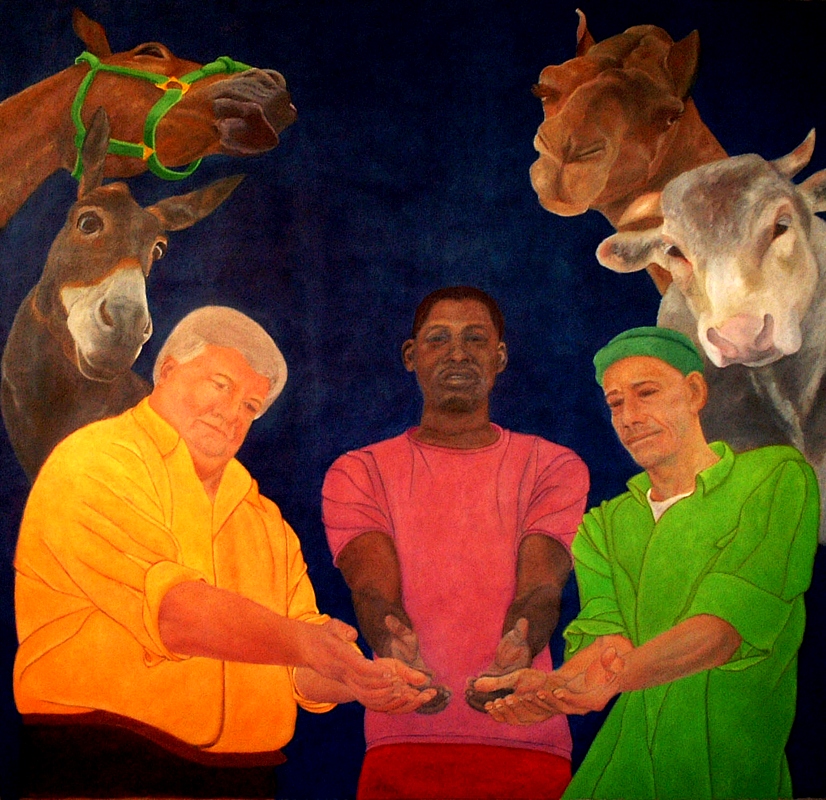 - L’adoration des mages, Dominique Jacqmain, 21e siècle, Belgique. Cette artiste de Bruxelles a peint plusieurs scènes bibliques dans des contextes contemporains. Ici, le point de vue est original : c’est celui de l’enfant Jésus, ce qu’il voit. Les mages, différents aussi par l’âge et l’origine, n’offrent que leurs mains ouvertes. Quatre animaux, cheval et chameau, âne et bœuf, ajoutent une note joyeuse.