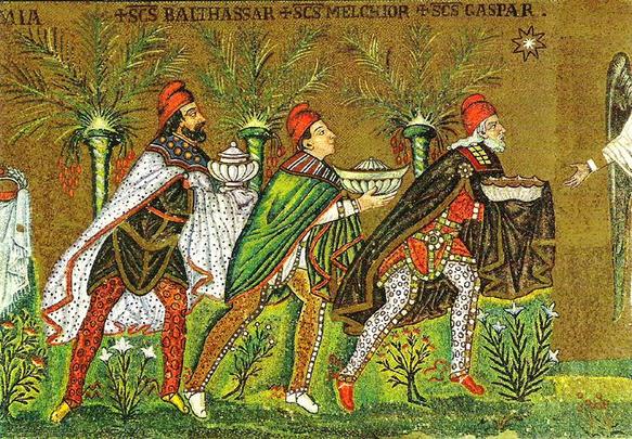 - Mosaïque, 6e siècle, Basilique St-Apollinaire-le-Neuf, Ravenne, Italie. Les mages arrivent avec leurs présents vers Marie et l’enfant Jésus, entourés d’archanges, sur la mosaïque suivante. Ils portent des bonnets phrygiens et leurs âges sont différents. Leurs noms sont inscrits en haut et l’étoile est à droite. Plantes et fleurs, costumes et couleurs, font de cette mosaïque une splendeur visuelle.
