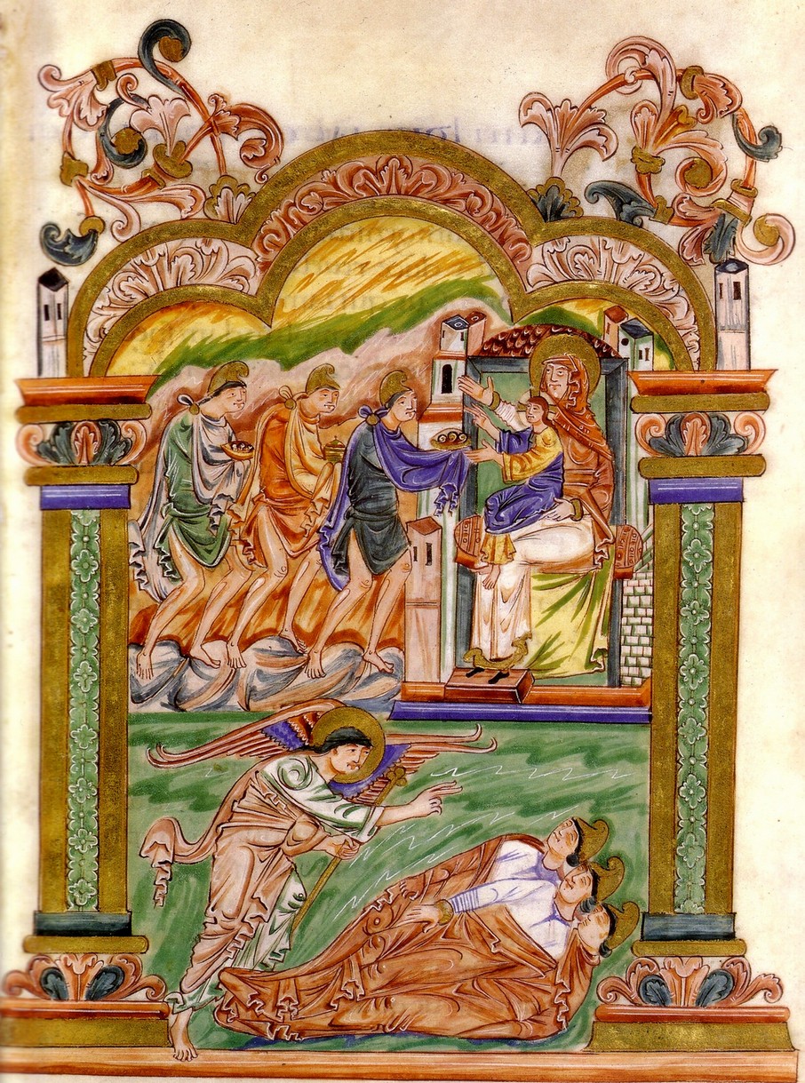 - L’adoration des Rois Mages, Missel de Robert de Jumièges, c.1020, Bibliothèque municipale de Rouen. Cette miniature médiévale reprend des éléments des œuvres précédentes, mais Marie et l’enfant accueillent les mages à bras ouverts. En bas, l’ange avertit en songe les mages dans leur sommeil. Fait rare, cet ange semble moustachu!