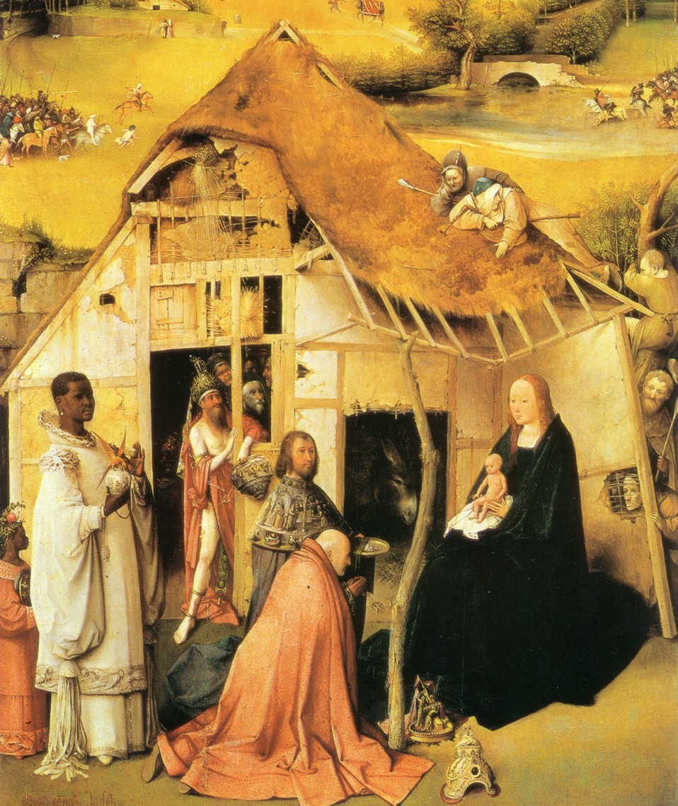 - L’adoration des Mages, Jérôme Bosch, panneau central d’un tryptique, 1495, Musée du Prado, Madrid. Cet artiste néerlandais a fait des œuvres fortes et étonnantes. Les mages sont différents par l’âge et l’origine; le plus jeune est très élégant. Mais la scène revêt un caractère très dramatique par plusieurs éléments : le sacrifice d’Isaac, cadeau aux pieds d’une Marie réservée; la figure grotesque moquant le Christ outragé à l’entrée de la maison; l’hostilité de forces malveillantes; des batailles à venir dans le paysage en haut; et bien d’autres détails symboliques.