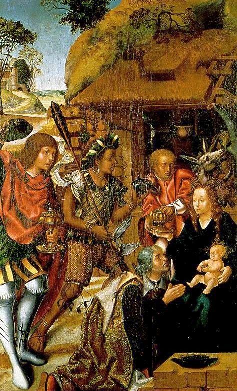 - Adoration des Mages, Vasco Fernandez, 1501, Grao Vasco National Museum, Viseu, Portugal. Aux éléments habituels de cette scène, une nouveauté est apportée. Au lieu d’un Noir, nous avons un Amérindien du Brésil, avec des caractéristiques très spécifiques. Les Européens commencent à découvrir les Amériques. Le peintre ici a compris la dimension d’universalité de ce récit, en incluant une figure nouvelle.