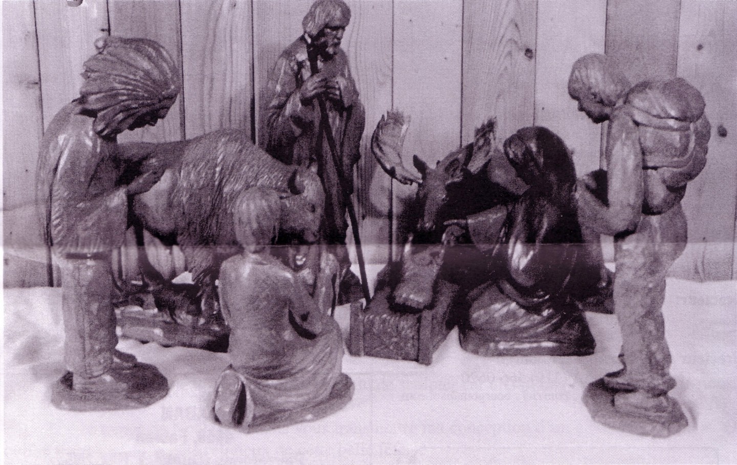 - André Bourgault, 20e siècle (avant 1957), Canada. Ce membre d’une illustre famille de sculpteurs de St-Jean-Port-Joli met en scène un chef autochtone, un jésuite, un coureur des bois, ainsi qu’un orignal de l’Est canadien et un bison de l’Ouest. C’est à la fois très inculturé et universel.