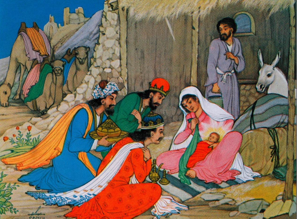 - Wise Men from the East, Hossein Behzad, 1958, Iran. Ce peintre iranien, de réputation internationale, a gardé vivante la tradition de la miniature perse, qu’il a aussi combinée à l’art contemporain.