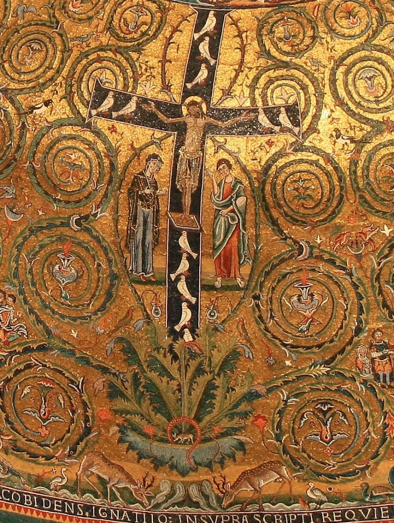 - Mosaïque, c.1130, abside, Église San Clemente, Rome, Italie. Voici une œuvre magnifique et impressionnante. La mère et le disciple, Marie et Jean, sont de chaque côté de la croix, sur laquelle sont posées douze colombes, évoquant les apôtres. Cette croix est entourée de plantes et de fleurs, d’oiseaux et d’animaux, comme une nouvelle création. Elle est source de vie et d’eaux vives. Nous sommes loin du sombre Moyen Age dont parlent nos médias.