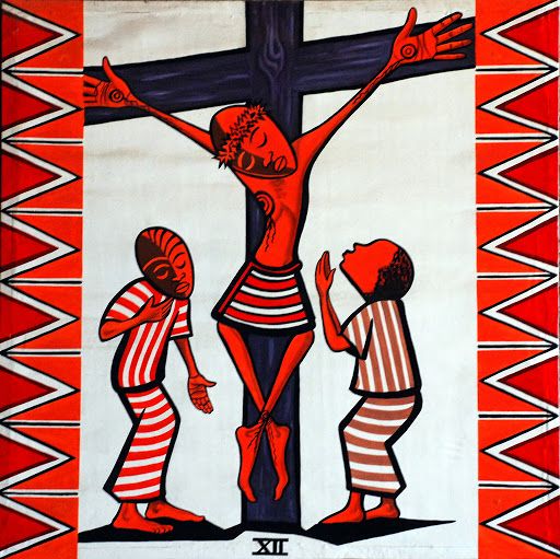 - Engelbert Mveng, Chemin de Croix XII, c.1960, Chapelle du Collège Hekima, Nairobi, Kenya. Ce jésuite camerounais, artiste et théologien, assassiné en 1995, s’inspire de différents arts traditionnels du continent africain. Dans ce chemin de croix, tous les visages sont des masques référant à des figures et fonctions. Les couleurs sont signifiantes : le noir pour la souffrance, le rouge pour la vie, le blanc pour le deuil.