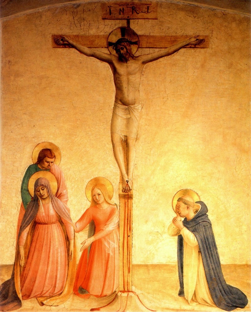 - Fra Angelico (Giovanni di Fiesole), fresque, c. 1440-1442, cellule 43, Couvent San Marco, Florence, Italie. À gauche, la mère et le disciple sont rapprochés; Marie de Magdala est avec eux. Au centre, sur la croix, le Christ est montré dans son humanité fragile et donnée, comme il l’est fréquemment chez ce dominicain toscan dont l’art est sa prédication. La scène est dépouillée, sans décor. À droite, saint Dominique est en prière : le frère, dont c’est la cellule, peut s’identifier à lui et entrer dans la fresque. L’image ne se regarde pas en restant en extériorité. Elle est parole qui invite à avancer.
