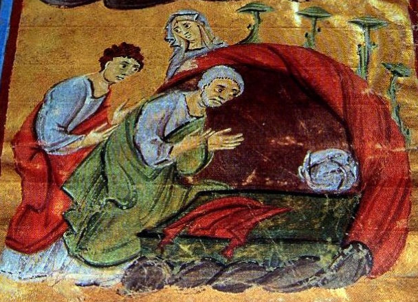 - Miniature, c.1000, Évangéliaire d’Otton III, Bayerische Staatsbibliothek, Munich, Allemagne. Cet ouvrage a été produit à l’Abbaye bénédictine de Reichenau, qui était à l’époque très réputée en Europe pour ses manuscrits enluminés. La scène se passe à l’entrée du tombeau, avec les signes offerts au regard. Les trois figures du récit sont présentes : Marie de Magdala, le jeune disciple et Pierre l’aîné.