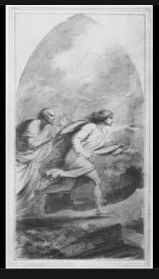 - Benjamin West, c.1780, ébauche pour un vitrail de la Chapelle Saint-Georges, Château de Windsor, Angleterre. Ce peintre américain de la Pennsylvanie, réputé pour ses scènes historiques et bibliques, s’est installé en Angleterre en 1763 au service du roi. Il est célèbre au Canada pour son œuvre (1770) : La mort du Général Wolfe. Ici, la course est vive, avec le jeune disciple, énergique, légèrement en tête du vieux Pierre!