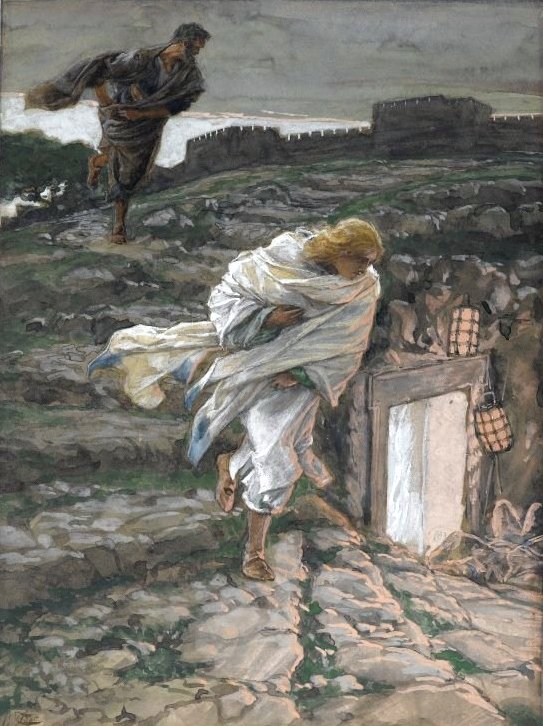 - James Tissot, c.1886-1894, Brooklyn Museum, États-Unis. Ce peintre français, qui a bien connu la Terre Sainte, a mis en images la majorité de scènes des évangiles. Ici, le jeune Jean arrive au tombeau le premier, mais il n’entre pas. Pierre suit, un peu essoufflé! Leurs corps et vêtements sont en mouvement. C’est l’aube et le tombeau est éclairé de l’intérieur.