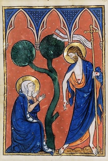 - Maitre Henri, miniature, c.1285, fol. 45v, Livre d’Images de Madame Marie, Bibliothèque nationale de France, Paris. Ce livre a été fait à Cambrai, au nord de la France, pour une riche et pieuse aristocrate, Marie de Rethel, d’où le titre; elle y apparaît dix fois. Ses 87 miniatures présentent des scènes de la vie du Christ et des saints. Ici, Jésus ressuscité et souriant montre ses plaies à Marie agenouillée; il porte l’étendard victorieux de la croix. Les deux figures sont unies par le regard et par le bleu. L’arbre évoque le jardin.