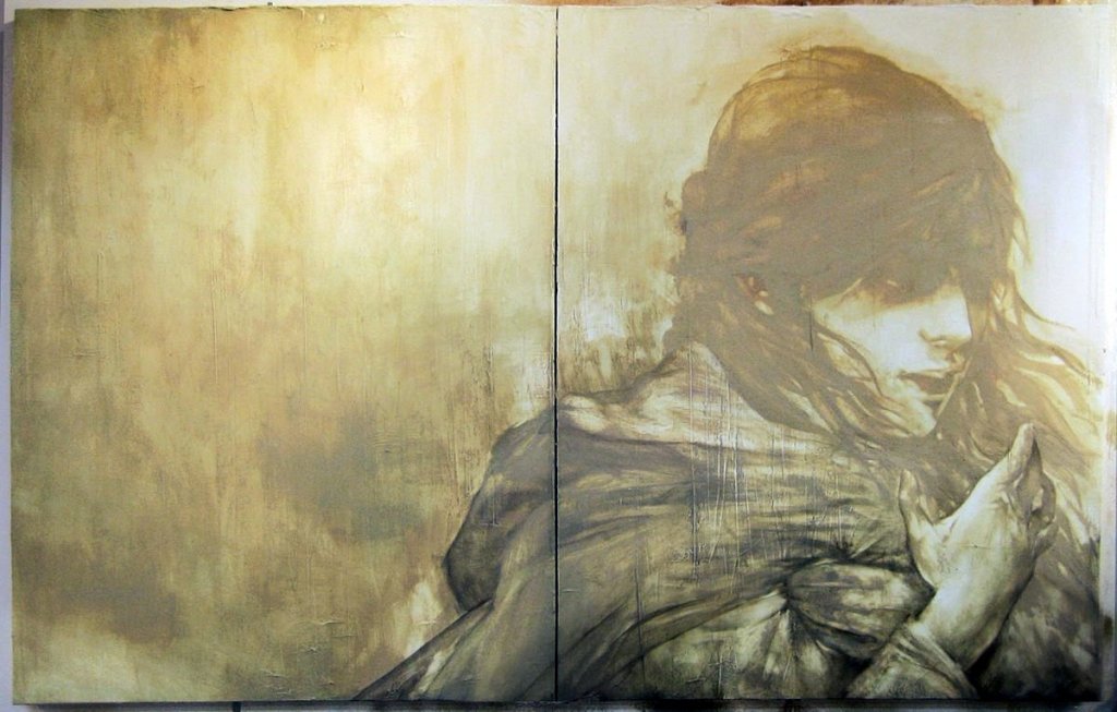 - Katerina Kuziv, 21e siècle, site iconart-gallery.com, Ukraine. Cette jeune artiste de Lviv en Ukraine est engagée dans un renouveau de l’iconographie. Le bleu est très présent dans ses œuvres. Ici, à droite, la croix est visible et le jardin est évoqué par les plantes. Le Christ confie une mission à Marie, qui la reçoit avec attention. Katerina voit ainsi le sens et le but de son art: « Le temps où je crée l’icône est ma façon de prier, de m’interroger, de chercher, le temps d’être avec Dieu, devant Dieu, … Le but est d’exprimer « l’incarnation » de la Parole de Dieu dans une image visuelle, où un contact avec la réalité de Dieu doit avoir lieu pour éveiller un désir de Dieu, … »