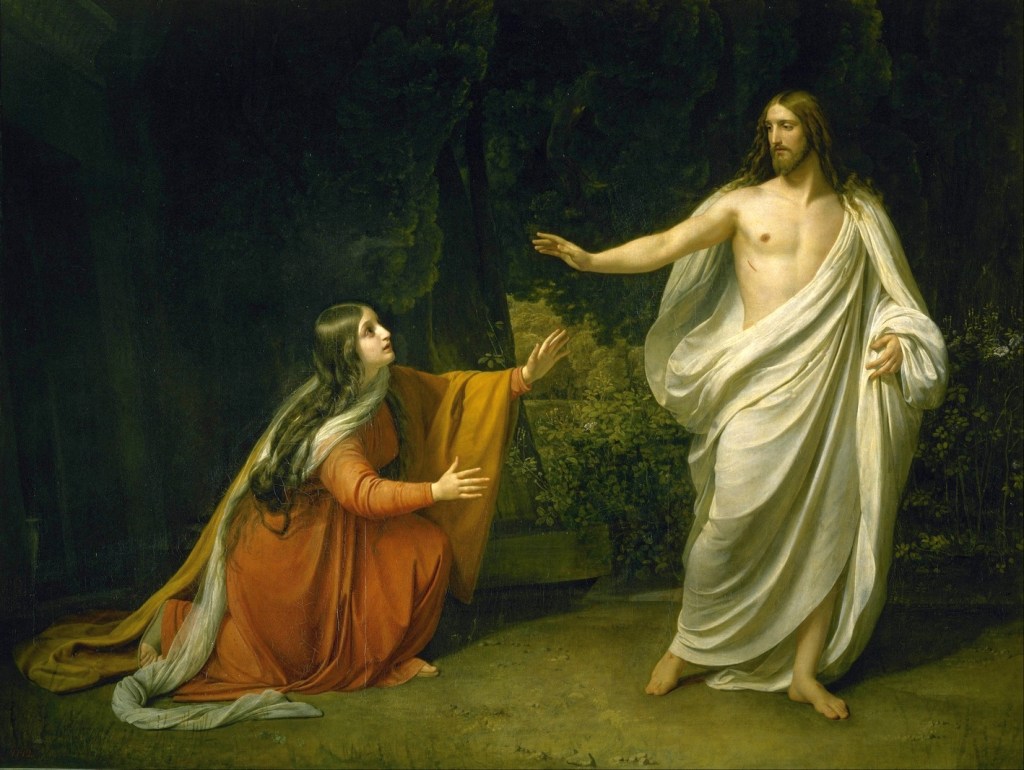 - Alexandre Andreïevitch Ivanov, Musée Russe, Saint-Pétersbourg, Russie. Ce peintre de Saint-Pétersbourg, de style néo-classique, a passé une bonne partie de sa vie à Rome. Il a fait plusieurs scènes bibliques, dont sa plus célèbre : L’Apparition du Christ au peuple (cf. Chronique sur Jean Baptiste). L’Apparition du Christ à Marie Madeleine a un côté dramatique, un peu théâtral, avec des contrastes de couleur et lumière, sur un fond noir, et le mouvement des deux personnages. La scène est le moment où le Christ dit : Ne me retiens pas.