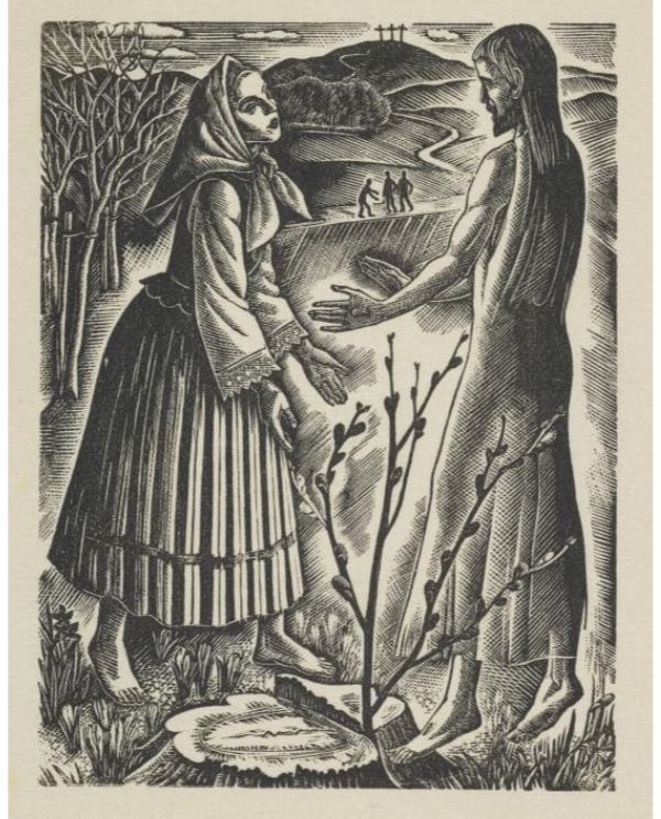 - Jozef Sekalski, gravure, 1947, Scottish National Gallery of Modern Art, Edinburg, Écosse. Ce peintre polonais, imprimeur et graveur, a travaillé en Écosse. Le Christ et Marie sont tous deux debout, ce qui est rare, et communiquent par le regard. Marie a l’allure d’une paysanne. Au loin, les trois croix sur le mont; puis une route, avec trois figures (Emmaüs?). L’arbre, à l’avant, est coupé, mais une nouvelle pousse apparaît, celle de l’espérance.