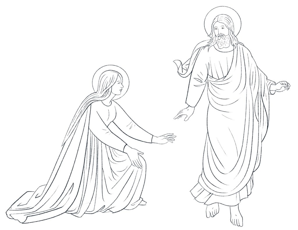 Marie est dans une dynamique de la perte, du deuil; elle pleure. Elle ne peut reconnaître dans le jardinier celui qu’elle cherche. Pour que ses yeux de croyante s’ouvrent, elle a besoin d’être appelée personnellement, par son nom, et par cette voix unique du pasteur bon, du Maître qu’elle a suivi. Puis, elle entre dans une nouvelle étape comme disciple, celle de la relation au Ressuscité, et non d’abord au Jésus d’une présence plus immédiate, qu’elle doit laisser : Ne me retiens pas, ou Ne me touche pas. Vient ensuite la mission qui lui est confiée : annoncer aux autres disciples la résurrection du Seigneur, ce qu’elle fait. Où ai-je entendu mon nom? En quels jardins et lieux de moi-même cette voix m’a-t-elle touché? Et alors, à qui suis-je appelé, envoyée, pour leur annoncer la Bonne Nouvelle?