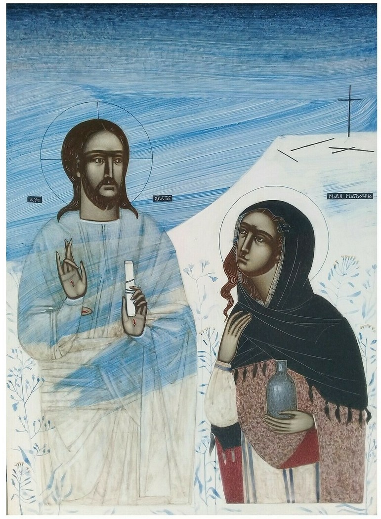 - Katerina Kuziv, 21e siècle, site iconart-gallery.com, Ukraine. Cette jeune artiste de Lviv en Ukraine est engagée dans un renouveau de l’iconographie. Le bleu est très présent dans ses œuvres. Ici, à droite, la croix est visible et le jardin est évoqué par les plantes. Le Christ confie une mission à Marie, qui la reçoit avec attention. Katerina voit ainsi le sens et le but de son art: « Le temps où je crée l’icône est ma façon de prier, de m’interroger, de chercher, le temps d’être avec Dieu, devant Dieu, … Le but est d’exprimer « l’incarnation » de la Parole de Dieu dans une image visuelle, où un contact avec la réalité de Dieu doit avoir lieu pour éveiller un désir de Dieu, … »
