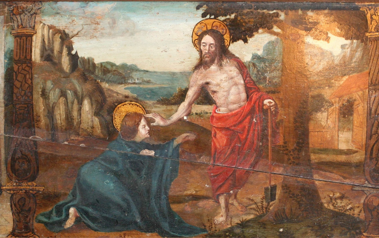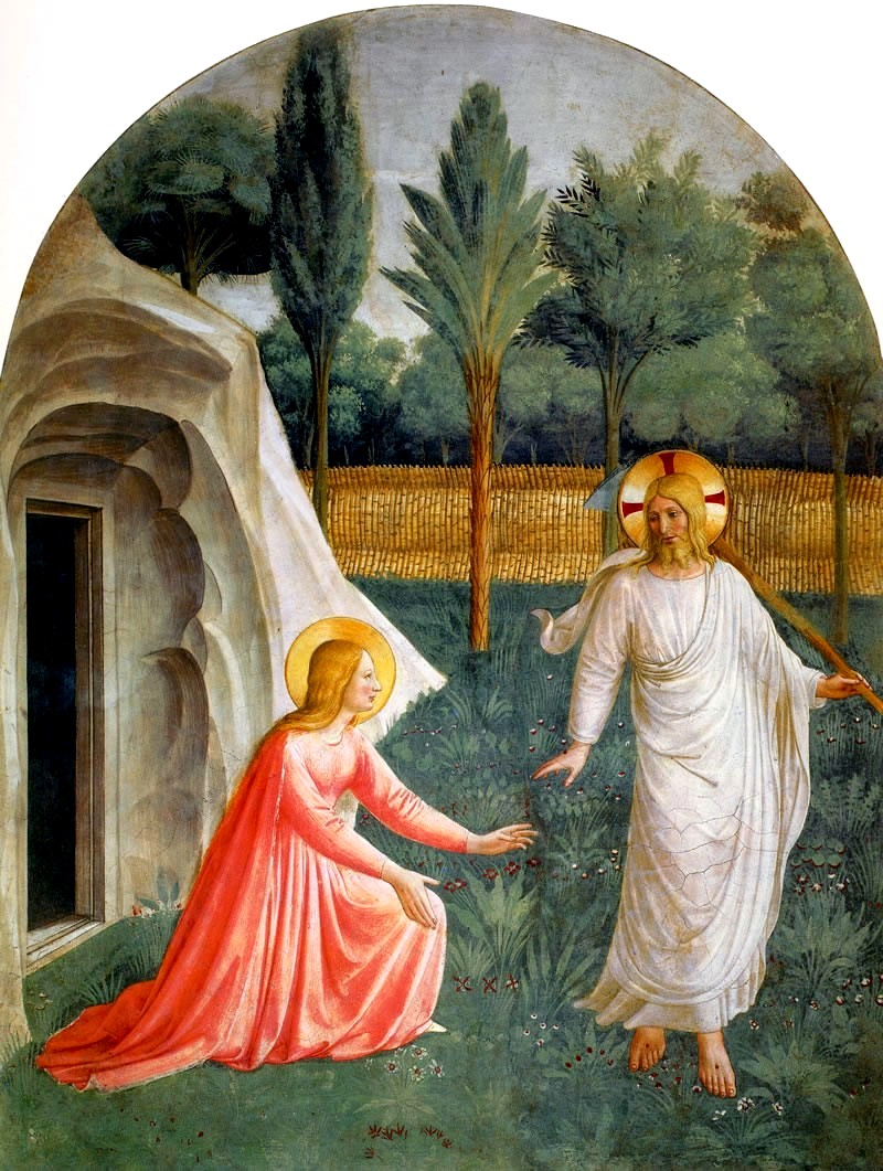 - Fra Angelico (Giovanni di Fiesole), fresque, c.1440-1442, cellule 1, Couvent San Marco, Florence, Italie. Pour le dominicain Fra Giovanni, cette œuvre est importante. C’est surtout lui qui l’a faite, et non d’abord l’équipe de son atelier. L’œuvre est à la fois simple et subtile. Le tombeau ouvert à gauche, avec son rectangle noir. Le Christ lumineux, avec les marques de la croix et son outil de jardinier. Marie agenouillée, les bras ouverts, belle et gracieuse. Ils communiquent par le regard. Le Christ lui dit : Ne me retiens pas. Et puis le jardin, qui est central : il évoque celui de la création, comme dans ses Annonciations. Le rouge des fleurs est fait de la même couleur que celui du sang du Christ sur la croix. Ainsi création, incarnation, passion et résurrection s’inscrivent dans un même mystère, celui du salut. Cette théologie est exprimée picturalement.