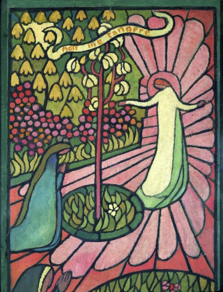 - Maurice Denis, 1895, Musée départemental Maurice Denis, St-Germain-en-Laye, France. Ce peintre du groupe des Nabis, marqué par le symbolisme et l’Art Nouveau, a fondé les Ateliers d’Art sacré, qui ont eu un rôle important pour le renouveau de l’art chrétien au 20e siècle. Le jardin prédomine, avec un arbre de vie au milieu. Marie est agenouillée, le Christ a les bras ouverts. Le tout est à la fois joyeux et recueilli.