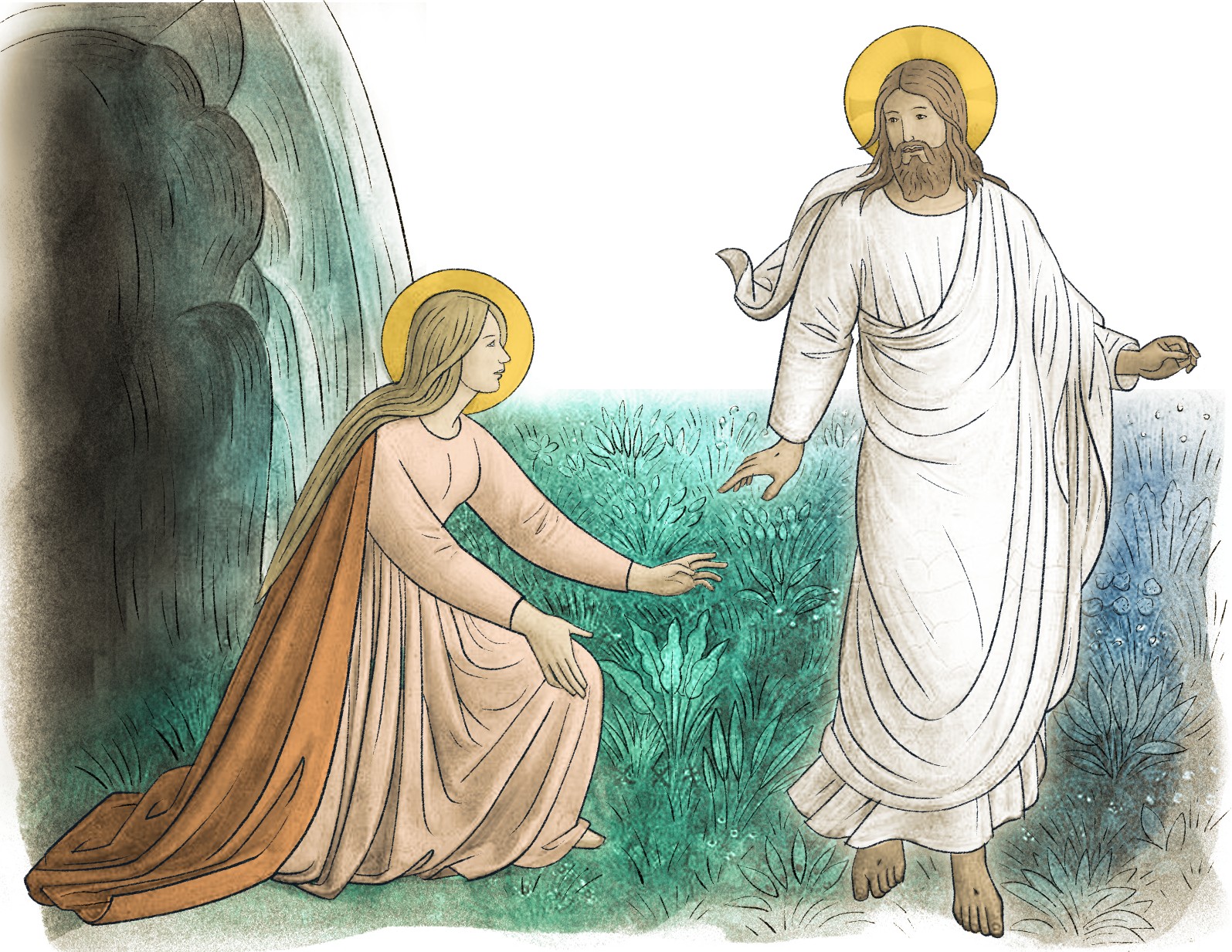 Marie est dans une dynamique de la perte, du deuil; elle pleure. Elle ne peut reconnaître dans le jardinier celui qu’elle cherche. Pour que ses yeux de croyante s’ouvrent, elle a besoin d’être appelée personnellement, par son nom, et par cette voix unique du pasteur bon, du Maître qu’elle a suivi. Puis, elle entre dans une nouvelle étape comme disciple, celle de la relation au Ressuscité, et non d’abord au Jésus d’une présence plus immédiate, qu’elle doit laisser : Ne me retiens pas, ou Ne me touche pas. Vient ensuite la mission qui lui est confiée : annoncer aux autres disciples la résurrection du Seigneur, ce qu’elle fait. Où ai-je entendu mon nom? En quels jardins et lieux de moi-même cette voix m’a-t-elle touché? Et alors, à qui suis-je appelé, envoyée, pour leur annoncer la Bonne Nouvelle?