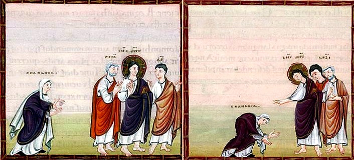 - Miniature, Codex Egberti, folio 35, verso, c.980, Bibliothèque municipale de Trèves, Allemagne. Ce manuscrit a été réalisé par l’abbaye bénédictine de Reichenau pour Egbert, évêque de Trèves. Deux scènes sont présentées. Dans la première, la Cananéenne, debout, s’approche de Jésus qui ne la regarde pas ; il est entouré de Pierre et Jean. Dans la deuxième, elle s’incline et implore ; Jésus est tourné vers elle, ainsi que les deux disciples. Ces deux postures montrent que le texte a été bien lu. Chaque figure est identifiée par une écriture.